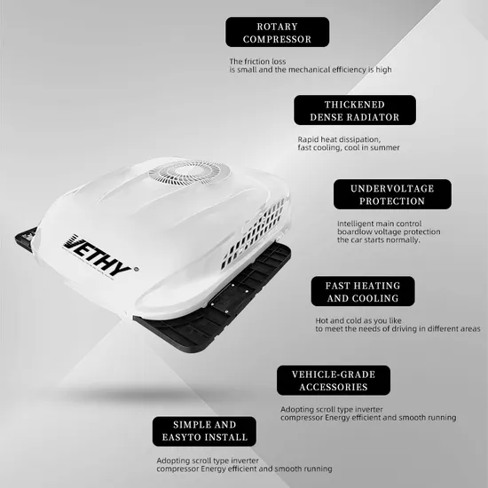 Roof-mounted electric air conditioning unit with independent cooling & heating, ventilating, and air filtering functions. CE certified, 12-month warranty, ideal for various vehicles.