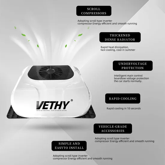 Energy-saving inverter compressor with eco-friendly R134A refrigerant. Cooling-only function with 2000W rated cooling capacity. Remote controlled, suitable for trucks, RVs, trailers. Non-destructive installation, ODM/OEM available.